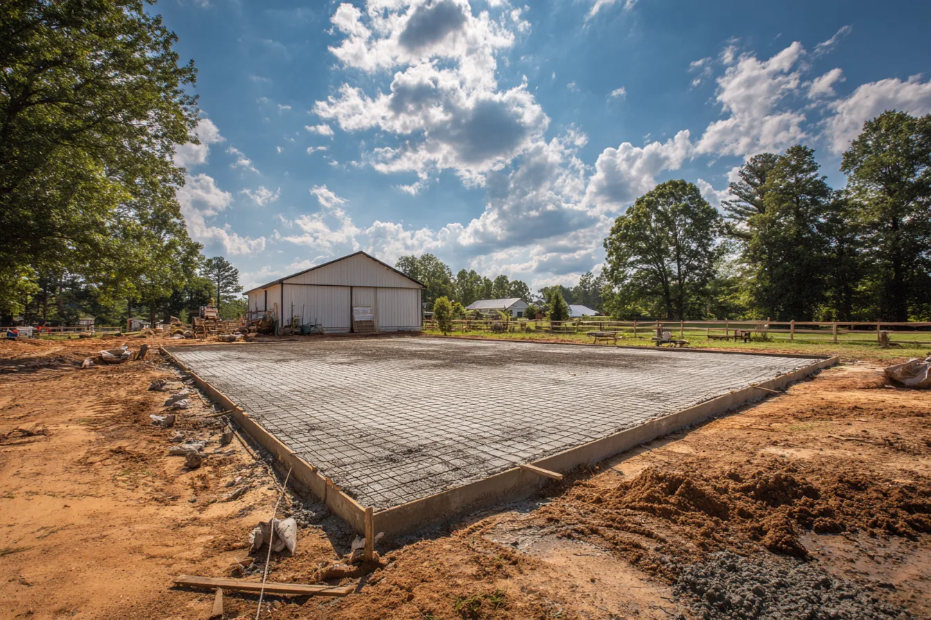 reinforced concrete slab foundation for barndominium construction ready for framing stage timeline