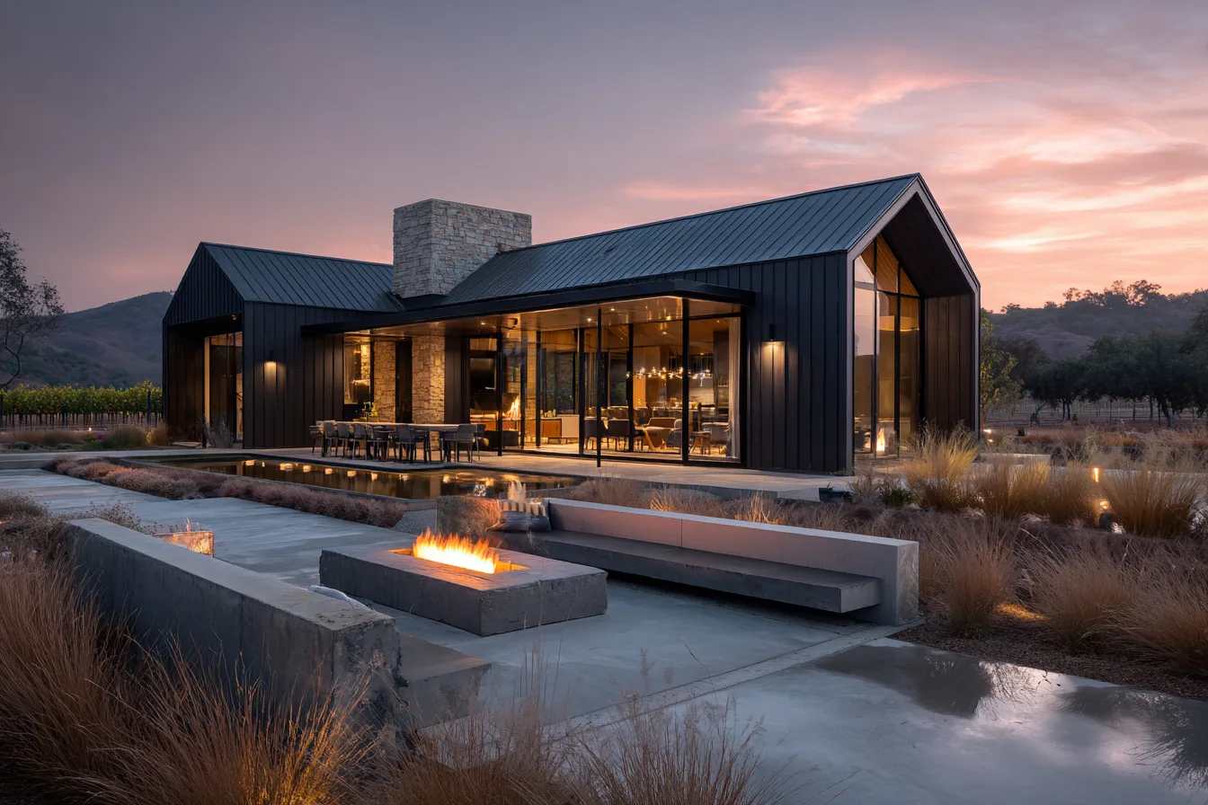 A contemporary black metal barndominium with a luxury outdoor kitchen and fire pit at twilight, representing high-yield short-term rental investment potential.