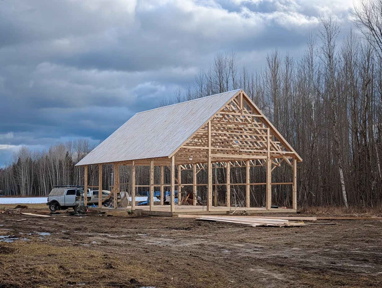 Pole barn under construction showing post frame structure and open framing before walls are installed